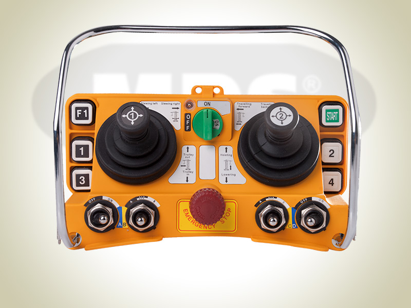 Radiocontroles MDS compatible para todo tipo de sistemas de grúas Aplicaciones: sistemas de grúas con amplios rangos de velocidad, grúas para tareas de precisión, grúas con electroimanes, pulpos y dispositivos electromecánicos de toma de cargas en general, grúas siderúrgicas, controles desde cabina de mando, grúas torre, etc. Descripción: 2 joysticks XY (2 ejes) con 5 escalonamientos de velocidad 6 pulsadores simple efecto 2 switchs de 3 posiciones 2 switchs de 2 posiciones Parada de emergencia Interruptor ON/OFF rotativo c/llave