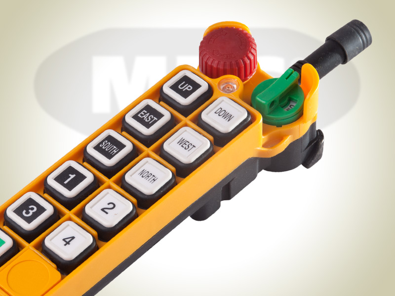 Diseño ergonómico y robusto 10 pulsadores doble efecto parada de emergencia interruptor ON/OFF rotativo c/llave Aplicaciones: todo tipo de sistemas de grúas, carros transportadores, grúas de torre, montacargas de obras civiles operados desde diferentes alturas, plataformas y grúas montadas en camiones, etc.