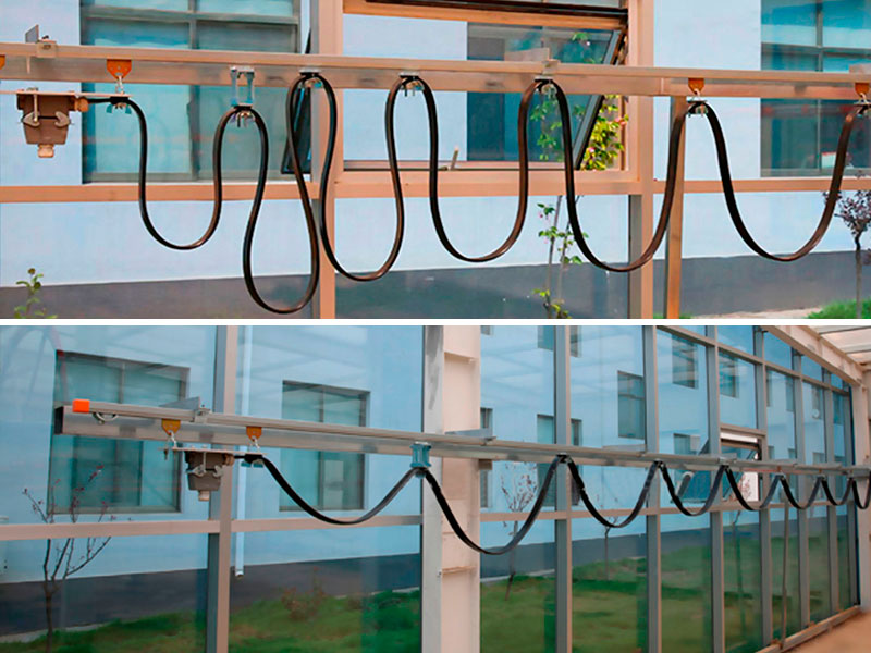 Guía laminada galvanizada con carritos metálicos y accesorios para fijación de los conductores, cable tipo festón extraflexible. Capacidad: según tamaño de cable tipo festón. Aplicaciones: alimentaciones de poca potencia y longitudes cortas, guía para cables y botonera de comando, servicio en ambientes con baja polución.