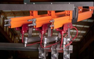 Barras individuales para cada fase, robustas y sin partes vivas expuestas disminuyendo el riesgo de contacto accidental, muy bajo mantenimiento reduciendo tiempos inactivos y paradas imprevistas, sección de la barra y diseño del colector que permiten sistemas con sectores curvos. Capacidad: 110 Amp. 250 Amp. 350 Amp. 500 Amp. Aplicaciones: monorrieles y sistemas de transporte y almacenamiento que presentan curvas en su trayectoria.